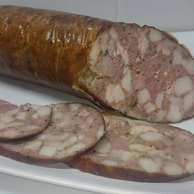 Колбаса варено-копченая из домашней свинины с добавлением фирменного шпика и авторский набор специй.