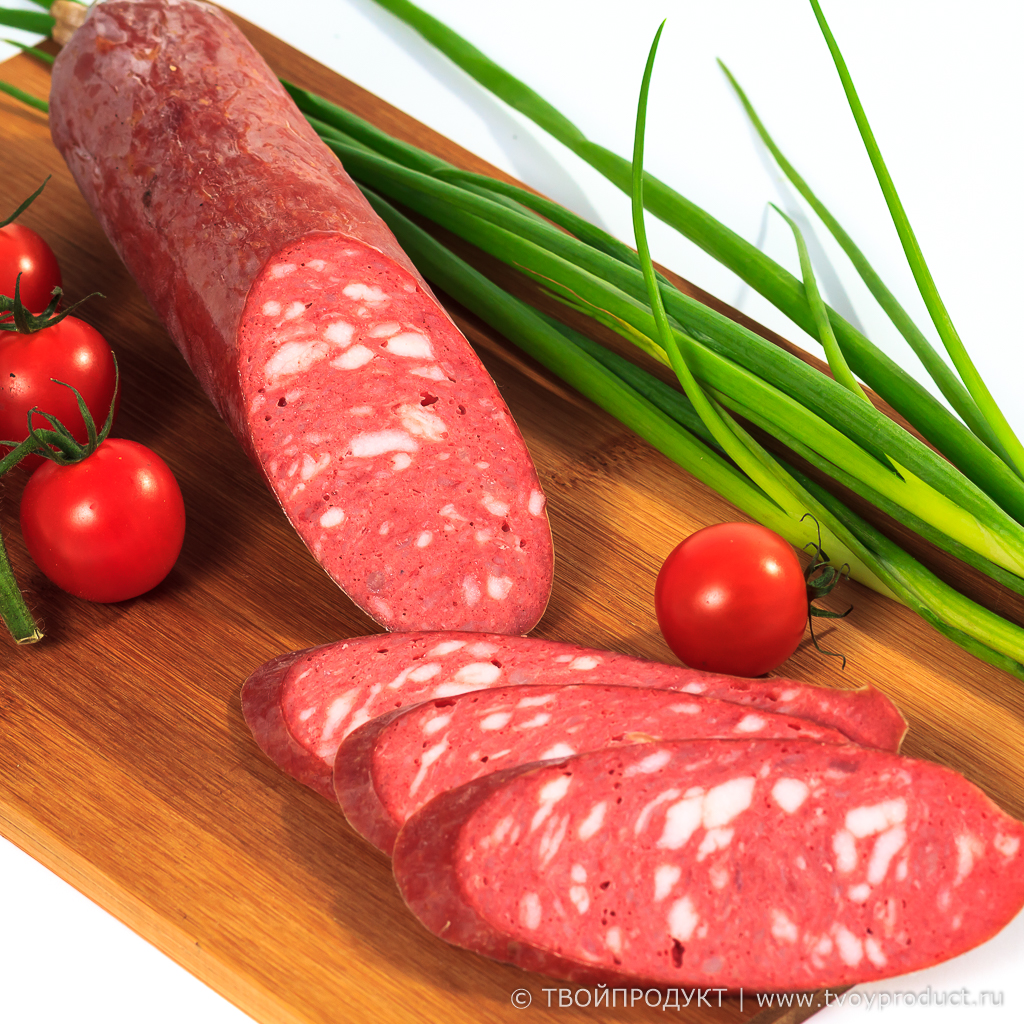 Колбаса Московская, варено-копченая. Состав: свинина, говядина, нитритно-посолочная смесь, перец. Натуральное копчение.