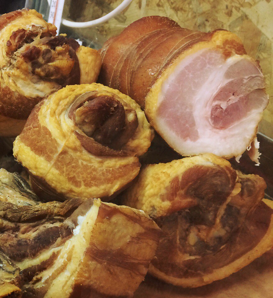 Свинина домашняя, копченая на ольхе/яблоне. Свинки растут на участке у нашего партнера в Ефремове Тульская область, 350км от МКАД. Рядом с участком находится элеватор по пореработке зерна, так что никаких хим.добавок. Свинина паленая, забой производится на бойне, потому как дворовой забой запрещен по закону. С каждой свинки снимается проба вет.врачем.