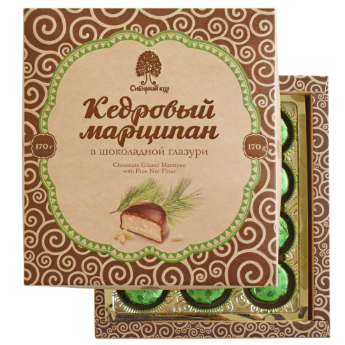 Вместо привычного европейцами миндаля здесь перетёрты ядра сибирского кедрового ореха, смешанные с цельным сухим молоком и покрытые шоколадной глазурью.