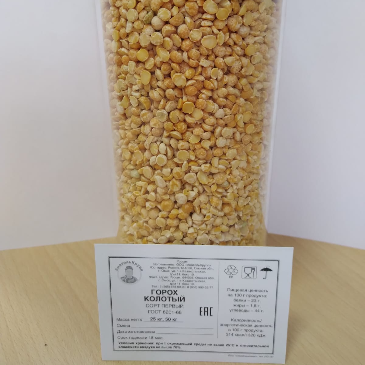Горох колотый сорт первый, качество соответствует требованиям ГОСТ 6201-68, масса нетто 25 кг, 540 кг, самовывоз, цена с НДС. Возможны большие объемы поставок.